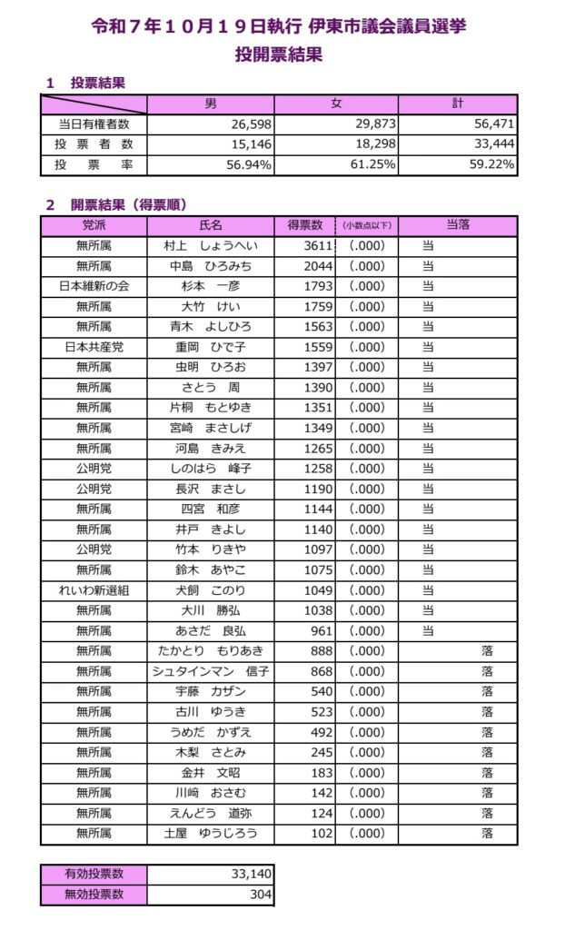 伊東市議会議員選挙が昨晩開票され体制が決まりました。