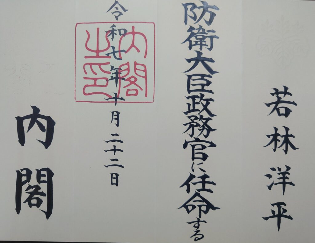 高市早苗総理大臣から辞令の交付があり、防衛大臣政務官に任命いただきました。